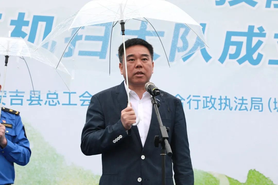 △縣人大常委會副主任、縣總工會主席王一明,縣總工會黨組書記、常務副主席朱車生,縣綜合執法局黨委書記、局長章熙翔,縣總工會黨組成員、副主席閻德順,縣綜合執法局黨委委員李斌為城區機掃大隊、城區機掃分隊授牌。